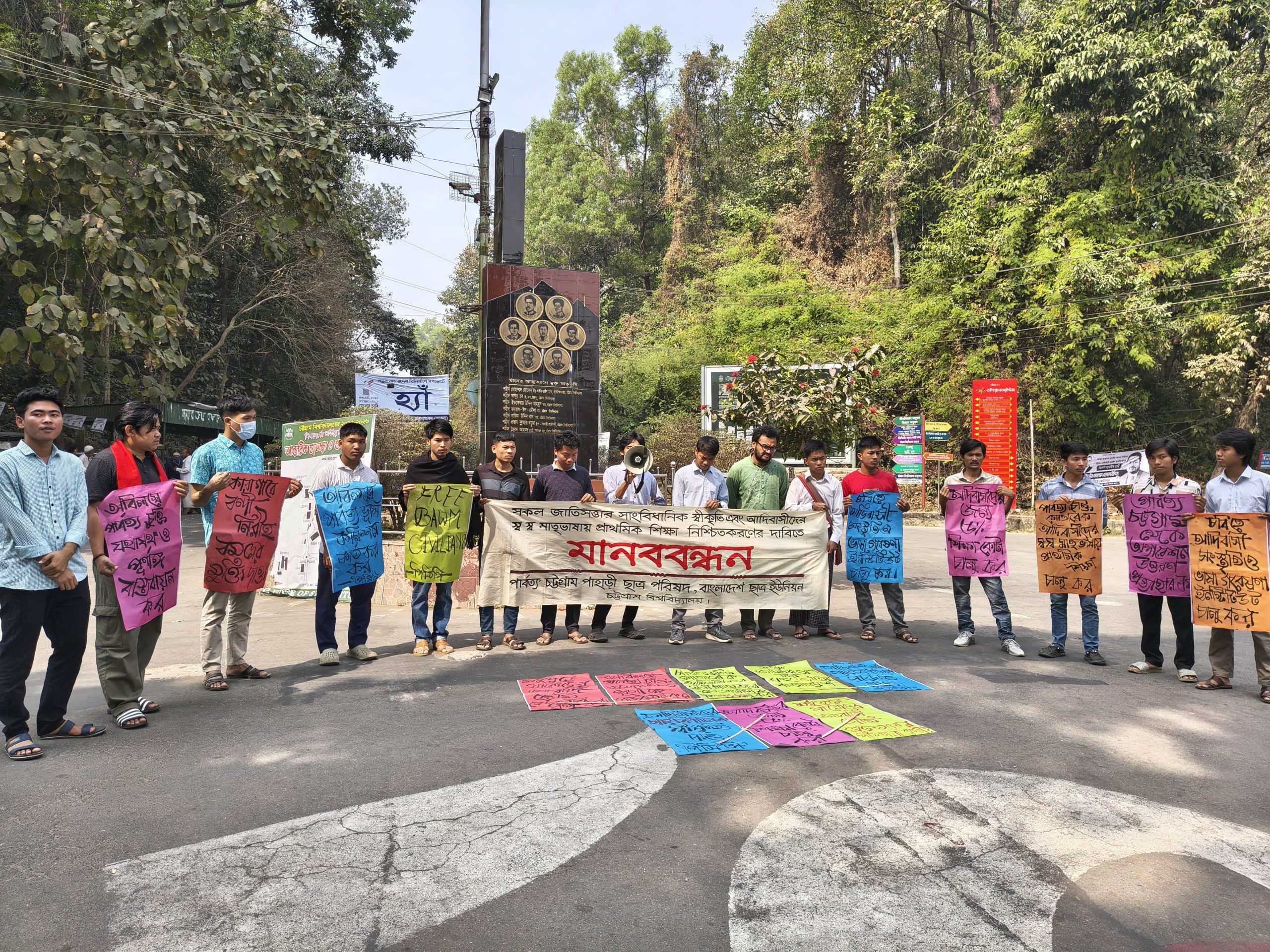 শনিবার ২১ ফেব্রুয়ারি সকল জাতিসত্তার সাংবিধানিক স্বীকৃতি এবং আদিবাসীদের স্ব স্ব মাতৃভাষায় প্রাথমিক শিক্ষা চালুকরণের দাবিতে চট্টগ্রাম বিশ্ববিদ্যালয় জিরো পয়েন্টে সকাল ১১ ঘটিকায় পার্বত্য চট্টগ্রাম পাহাড়ী ছাত্র পরিষদ(পিসিপি), চট্টগ্রাম বিশ্ববিদ্যালয় শাখা ও বাংলাদেশ ছাত্র ইউনিয়ন, চট্টগ্রাম বিশ্ববিদ্যালয় সংসদের উদ্যোগে এক মানববন্ধন অনুষ্ঠিত হয়।