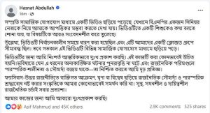 পোস্টে হাসনাত লিখেছেন, ‘সম্প্রতি সামাজিক যোগাযোগ মাধ্যমে একটি ভিডিও ছড়িয়ে পড়েছে, যেখানে বিএনপির একজন সিনিয়র নেতাকে নিয়ে আমাকে আপত্তিকর মন্তব্য করতে দেখা যায়। ভিডিওটিতে একটি শিশুকেও কথা বলতে শোনা যায়, যা বিষয়টিকে আরও সংবেদনশীল করে তুলেছে।’