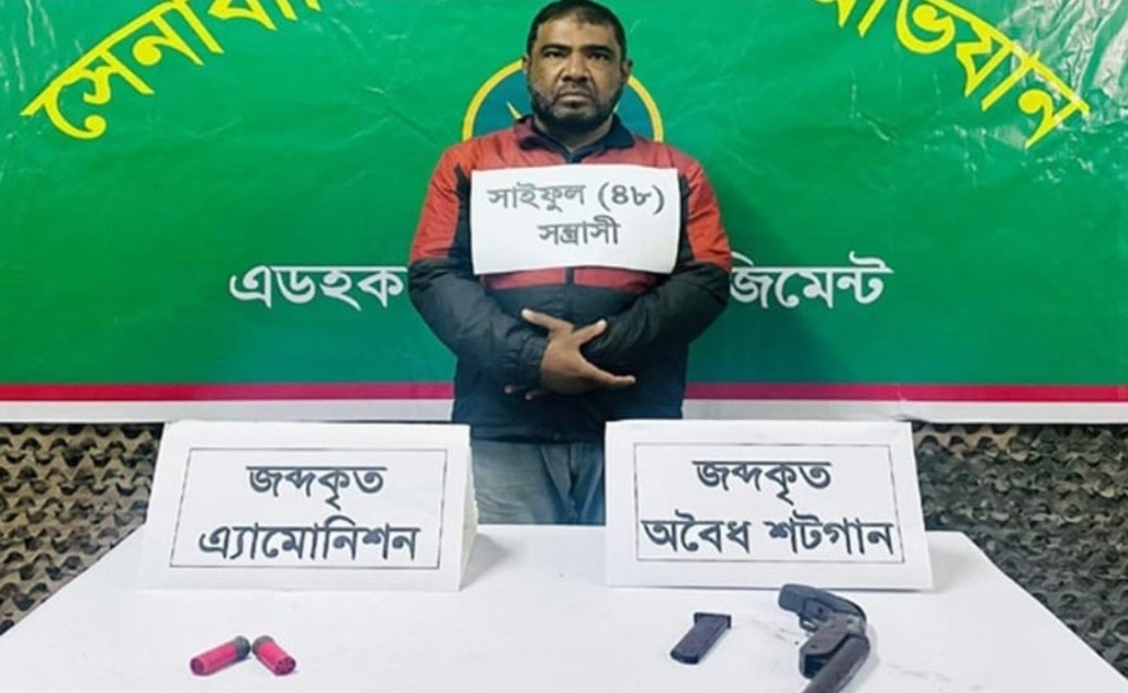 বোয়ালখালী উপজেলা এলাকা থেকে অস্ত্রসহ মো. সাইফুল আলম (৫৬) নামের এক ব্যবসায়ীকে গ্রেফতার করেছে সেনাবাহিনী। এসময় তার ব্যবসায়ীক প্রতিষ্ঠান গ্যাস সিলিন্ডারের দোকানে অভিযান চালিয়ে ১টি শটগান, ২টি গুলি এবং একটি পিস্তলের ম্যাগজিন উদ্ধার করা হয়।