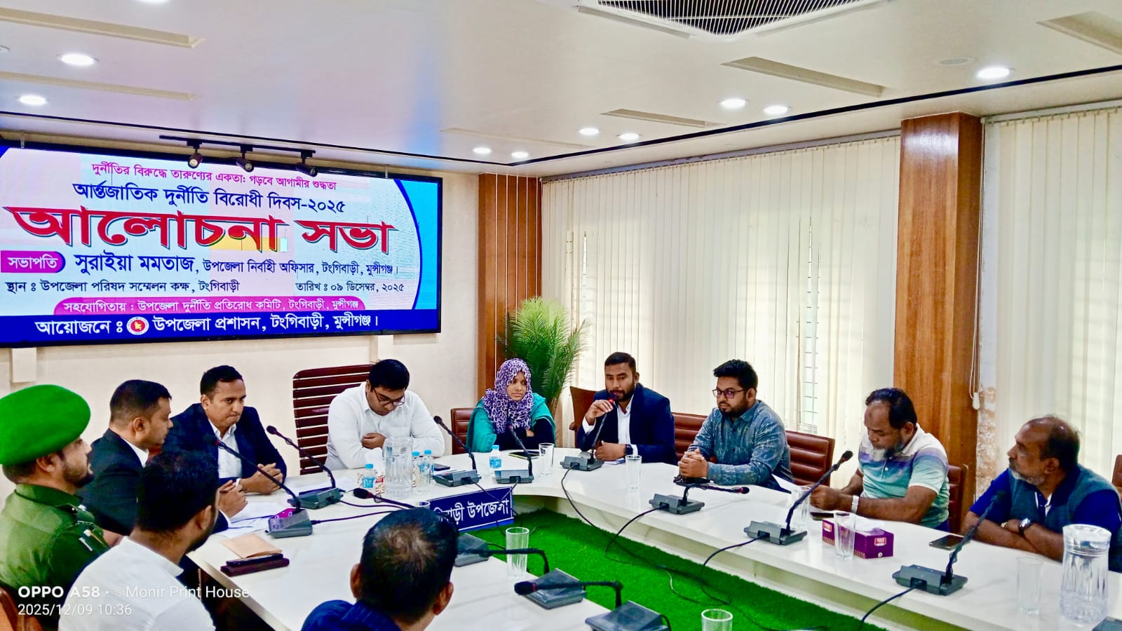 "দুর্নীতির বিরুদ্ধে তারুণ্যের একতা, গড়বে আগামীর শুদ্ধতা" স্লোগানে মুন্সীগঞ্জের টঙ্গীবাড়িতে আন্তর্জাতিক দুর্নীতি বিরোধী দিবস উপলক্ষে মানববন্ধন ও আলোচনা সভা অনুষ্ঠিত হয়েছে। মঙ্গলবার (৯ ডিসেম্বর) সকালে উপজেলা প্রশাসনের আয়োজনে এবং উপজেলা দুর্নীতি প্রতিরোধ কমিটির সহযোগিতায় এ কর্মসূচি অনুষ্ঠিত হয়।