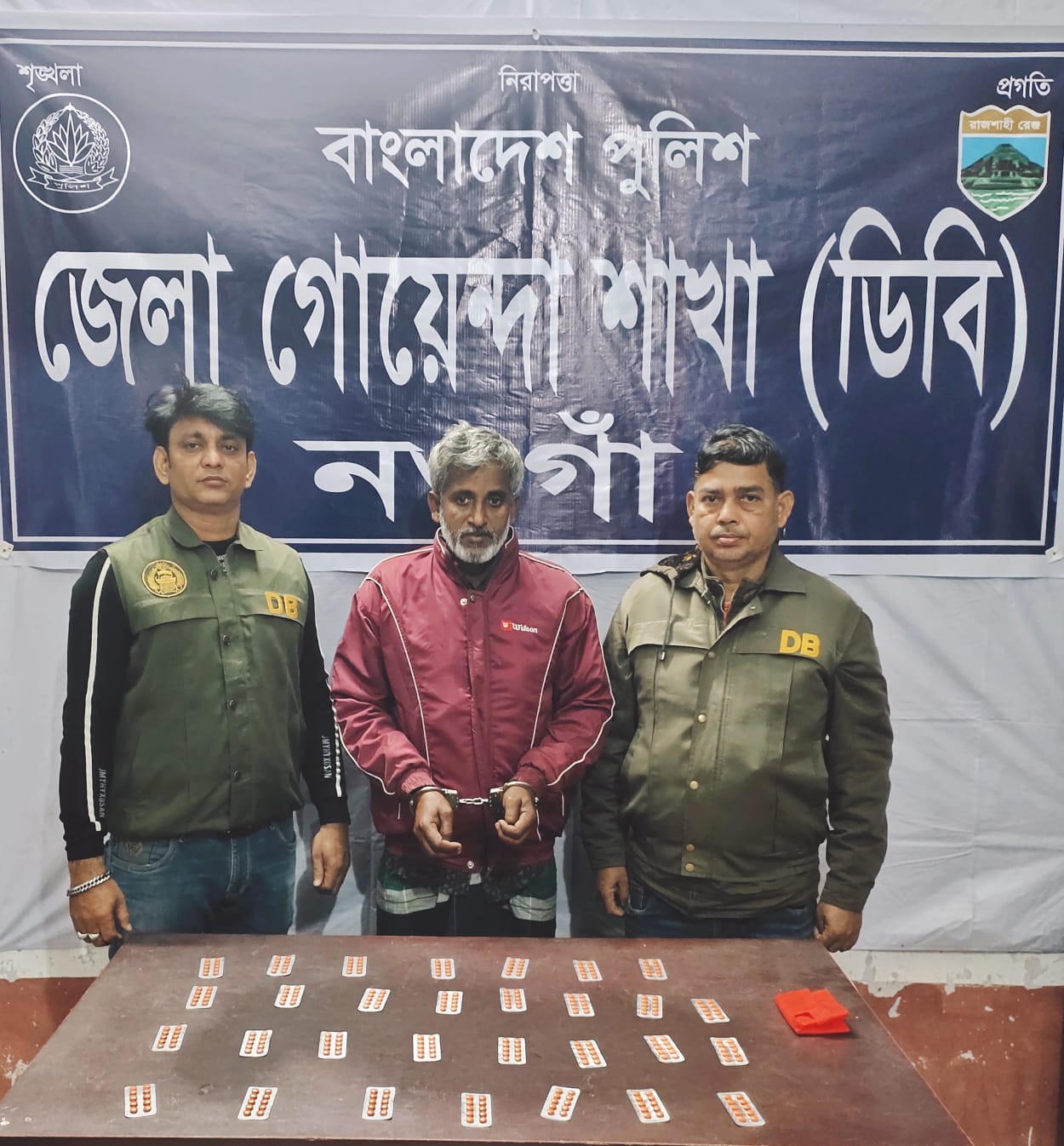 নওগাঁয় ডিবি পুলিশ পৃথক অভিযান চালিয়ে ৫০০পিচ নেশা জাতীয় ট্যাপেন্টাডল ট্যাবলেট উদ্ধার করেছে। সেই সাথে নেহেরুল ইসলাম (৪৮) নামে একজনকে আটক করেছে। আটককৃত নেহেরুল ইসলাম বদলগাছী উপজেলার হাপানিয়া এলাকায় আফছার আলীর ছেলে।৮ ডিসেম্বর সোমবার রাত সাড়ে ৭টায় এক ক্ষুদে বার্তায় বিষয়টি নিশ্চিত করেছেন পুলিশ সুপার মোহাম্মদ তারিকুল ইসলাম। এর আগে রোববার ৭ ডিসেম্বর রাতে বদলগাছী ও সাপাহার উপজেলায় পৃথক অভিযান চালিয়ে ট্যাপেন্টাডল ট্যাবলেট উদ্ধার ও তাকে আটক করা হয়।ডিবি পুলিশের ইনচার্জ মোহাম্মদ হাসিবুল্লাহ হাসিব বলেন, গোপন সংবাদের ভিত্তিতে জানা যায় মাদক কেনা বেচা হবে। তারই প্রেক্ষিতে রোববার রাত সাড়ে ৮টায় জেলার বদলগাছী থানাধীন একটি আম বাগানের পাশে থেকে নেহেরুল ইসলামকে আটক করা হয়। এসময় তার কাছ থেকে ৩০০ পিচ ট্যাপেন্টাডল ট্যাবলেট উদ্ধার করা হয়। আটক নেহেরুল ইসলামকে আদালতের মাধ্যমে জেলা হাজতে পাঠানো হয়েছে। অপরদিকে একই দিন সন্ধ্যা সাড়ে ৬ টায় সাপাহার থানাধীন আমডাংগা এলাকায় জনৈক সৈকতের আম বাগানে অভিযান চালানো হয়। এসময় ২০০পিচ ট্যাপেনটাডল ট্যাবলেট পরিত্যাক্ত অবস্থায় উদ্ধার করা হয়।