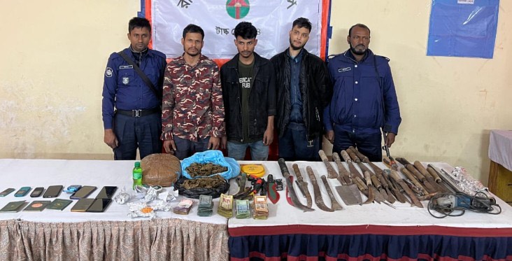 গ্রেফতারকৃতদের বাড়িতে তল্লাশি চালিয়ে ৮৮২ পিস ইয়াবা, ৩ কেজি ১০০ গ্রাম গাঁজা, দা, চাপাতি, রামদা, ছুরি, হাতুড়িসহ বিভিন্ন ধরনের দেশীয় অস্ত্র উদ্ধার করা হয়। এ ছাড়া ৩টি পাসপোর্ট, ৫টি স্মার্টফোন, ৪টি বাটন ফোন এবং নগদ ১ লাখ ৫ হাজার ৮৯০ টাকা জব্দ করা হয়েছে।