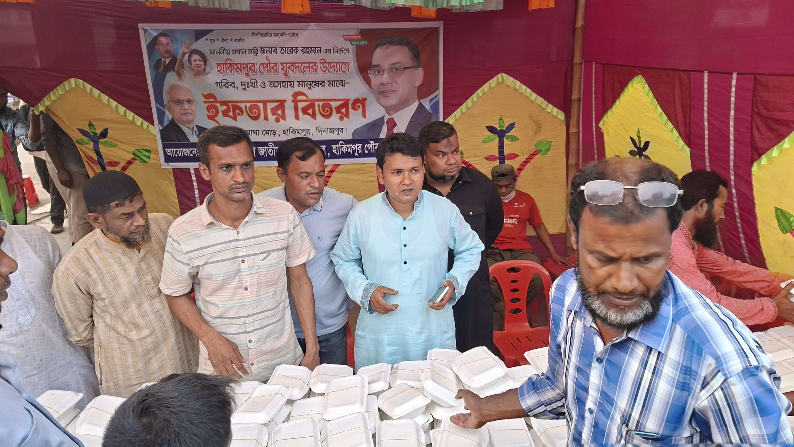 হাকিমপুর পৌর যুবদলের আহবায়ক মাজহারুল ইসলাম রাজ ও সদস্য সচিব আলী মুর্তজা সরকার বলেন, আগামীর বাংলাদেশ গড়ার স্বপ্নদ্রষ্টা জাতীয়তাবাদি দল বিএনপির চেয়ারম্যান মাননীয় প্রধানমন্ত্রী তারেক রহমানের দিক নির্দেশনা ও গণপ্রজাতন্ত্রী বাংলাদেশ সরকারের সমাজকল্যাণ এবং মহিলা ও শিশু বিষয়ক মন্ত্রণালয়ের মাননীয় মন্ত্রী আবু জাফর মোঃ জাহিদ হোসেন মহোদয় এর পরামর্শে আজ পৌর শহরের চারমাথা মোড়ে গরীব দুস্ত ও অসহায় মানুষের মাঝে ইফতার সামগ্রী বিতরণ করা হয়েছে। পরে বিএনপির প্রতিষ্ঠাতা শহীদ প্রেসিডেন্ট জিয়াউর রহমান তাঁর সহধর্মিণী মরহুম সাবেক প্রধানমন্ত্রী বেগম খালেদা জিয়ার রুহের মাগফেরাত কামনা ও দলের বর্তমান চেয়ারম্যান মাননীয় প্রধানমন্ত্রী তারেক রহমানের দীর্ঘায়ু ও সুস্থতা কামনা করে বিশেষ দোয়া করা হয়।