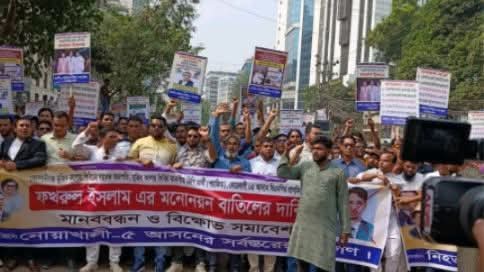 ফখরুলের প্রার্থিতা বাতিলের দাবিতে মানববন্ধন