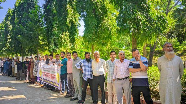নবম পে-স্কেল বাস্তবায়নের দাবিতে কুবি কর্মচারীদের মানববন্ধন