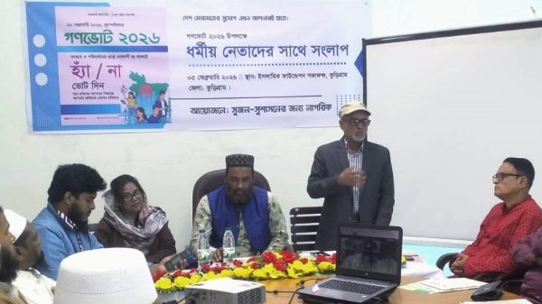কুড়িগ্রামে গণভোট-২০২৬ উপলক্ষে ধর্মীয় নেতা, ইমাম ও পুরোহিতদের সাথে সংলাপ করেছে সুশাসনের জন্য নাগরিক (সুজন)। ‘দেশ মেরামতের সুযোগ এখন আপনারই হাতে’—এই প্রতিপাদ্যকে সামনে রেখে আয়োজিত সংলাপে শান্তিপূর্ণ ভোটদান, জনসচেতনতা বৃদ্ধি