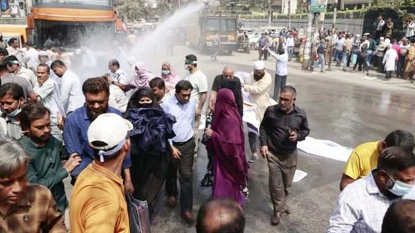তিন দফা দাবিতে বাংলাদেশ ব্যাংকের সামনে মানববন্ধন ও অবস্থান কর্মসূচি পালন করেছেন সম্মিলিত ইসলামী ব্যাংকের আমানতকারীরা। আন্দোলনকারীরা সড়কে অবস্থান নিলে আইনশৃঙ্খলা রক্ষাকারী বাহিনীর সদস্যরা ওয়াটারগান দিয়ে পানি ছুড়ে তাদের ছত্রভঙ্গ