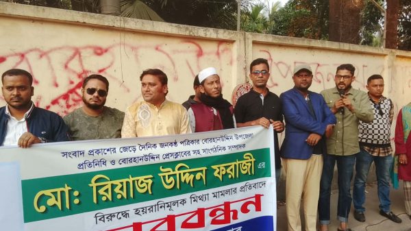 ভোলায় সাংবাদিক রিয়াজের বিরুদ্ধে মিথ্যা মামলা প্রত্যাহারের দাবিতে মানববন্ধন