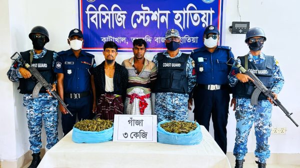 নোয়াখালীর হাতিয়া উপজেলায় কোস্ট গার্ড ও পুলিশের যৌথ অভিযানে ৩ কেজি গাঁজাসহ দুইজন মাদক কারবারিকে আটক করা হয়েছে। বৃহস্পতিবার (২৬ মার্চ ২০২৬) ভোররাত ৪টার দিকে গোপন সংবাদের ভিত্তিতে এই অভিযান