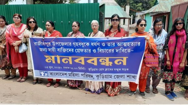 কুড়িগ্রামের রাজিবপুরে ধারের টাকা পরিশোধ করতে না পারায় সংঘবদ্ধ ধর্ষণ অত:পর দম্পতির বিষপানের ঘটনায় গৃহবধূ আশা খাতুনের মৃত্যু ও তাকে আত্মহত্যায় প্ররোচণা কারীদের আইনের আওতায় এনে দৃষ্টান্তমূলক শাস্তির দাবীতে মানববন্ধন