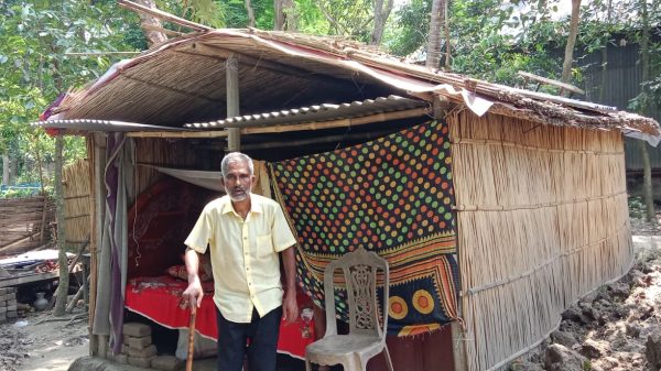 ফরিদপুরের নগরকান্দা উপজেলার ফুলসুতি ইউনিয়নের সাবেক মেম্বার পোড়াদিয়া গ্রামের বাসিন্দা জাকারিয়া হোসেন (৬০)পলিথিনের ছাউনি আর পাটখড়ির বেড়া দিয়ে ঘর বানিয়ে বসবাস করছেন স্ত্রী ও কন্যা সন্তান নিয়ে। তিনি বলেন, মাননীয়