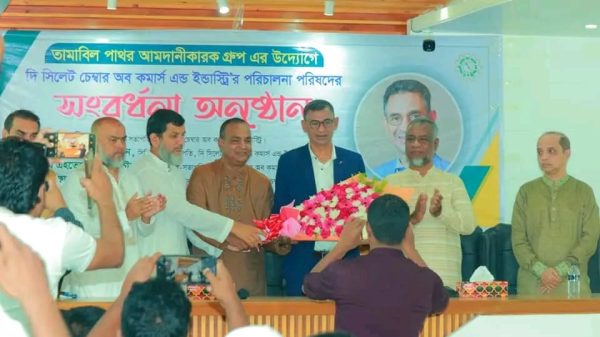 সিলেট চেম্বার নেতৃবৃন্দকে তামাবিল পাথর আমদানী কারক গ্রুপের পক্ষ থেকে সংবর্ধনা প্রদান করেন আমদানী কারক গ্রুপ। উক্ত সংবর্ধনা অনুষ্ঠানে সিলেট চেম্বারের সভাপতি তাহমিন আহমেদ সাংবাদিকদের জানান পাথর ব্যবসায়ীরা ষড়যন্ত্রের শিকার