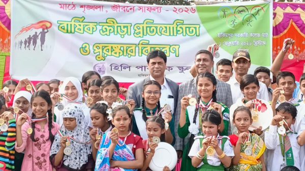 “মাঠে শৃঙ্খলা, জীবনে সাফল্য “এই প্রতিপাদ্য বিষয়কে সামনে রেখে দিনাজপুরের হিলিতে ঐতিহ্যবাহী শিক্ষা প্রতিষ্ঠান হিলি পাবলিক স্কুলের বার্ষিক ক্রীড়া প্রতিযোগিতা ও পুরস্কার বিতরণী অনুষ্ঠান অনুষ্ঠিত হয়েছে। আজ রবিবার সকাল ১০টায়
