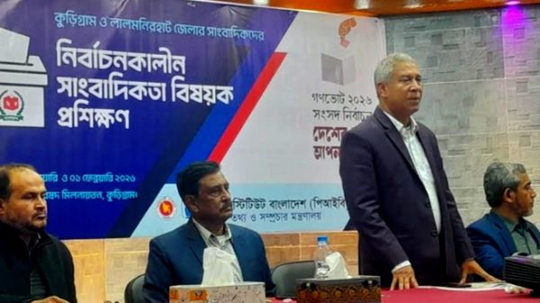নির্বাচনকালীন পেশাদার ও দায়িত্বশীল সাংবাদিকতা নিশ্চিত করতে কুড়িগ্রামে নির্বাচন রিপোর্টিং বিষয়ক দুই দিনের প্রশিক্ষণ শুরু হয়েছে। তথ্য ও সম্প্রচার মন্ত্রণালয়ের আওতাধীন প্রেস ইনস্টিটিউট বাংলাদেশ (পিআইবি)-এর আয়োজনে শনিবার (৩১ জানুয়ারি) সকালে