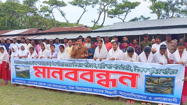শিক্ষার ন্যূনতম পরিবেশ নিশ্চিতের দাবিতে নোয়াখালীর হাতিয়ায় আবেগঘন মানববন্ধন করেছেন শিক্ষার্থী, অভিভাবক ও স্থানীয় এলাকাবাসী। উপজেলার চর আমানউল্যাহ এলাকার ঐতিহ্যবাহী হেদায়েত হোসেন উচ্চ বিদ্যালয়ের স্থায়ী ক্যাম্পাস নির্মাণ, শিক্ষক সংকট নিরসন