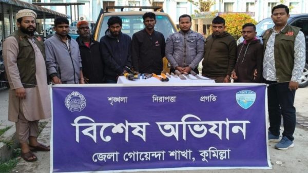 কুমিল্লায় অস্ত্রসহ ৭ আন্তঃজেলা ডাকাত সর্দারকে গ্রেফতার করেছে ডিবি পুলিশ। শুক্রবার (২৬ ডিসেম্বর) রাতে জেলার দাউদকান্দি উপজেলার ইলিয়টগঞ্জ বাজারে ডাকাতির প্রস্তুতিকালে তাদের গ্রেফতার করা হয়। গ্রেফতারকৃতরা হচ্ছে,দাউদকান্দি উপজেলার টামটা গ্রামের