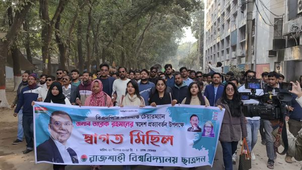 বিএনপি’র ভারপ্রাপ্ত চেয়ারম্যান তারেক রহমানের স্বদেশ প্রত্যাবর্তন উপলক্ষ্যে স্বাগত মিছিল করেছে রাজশাহী বিশ্ববিদ্যালয় (রাবি) শাখা ছাত্রদল। সোমবার (২২ ডিসেম্বর) বেলা ১টায় বিশ্ববিদ্যালয়ের বুদ্ধিজীবী চত্বর থেকে এ মিছিল বের হয়ে ক্যাম্পাসের