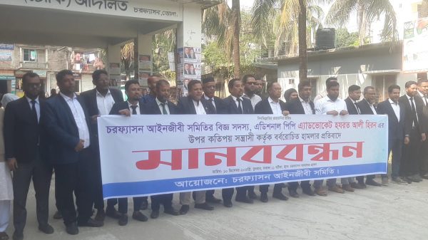 আদালত প্রাঙ্গণে এডিশনাল পিপি ও আইনজীবী সমিতির সদস্য অ্যাডভোকেট হযরত আলী হিরনের উপর সন্ত্রাসী হামলার প্রতিবাদে মানববন্ধন করেছে চরফ্যাশন আইনজীবী সমিতি । বুধবার (১০ নভেম্বর) বেলা ১১টায় চরফ্যাশন আদালত প্রাঙ্গণে